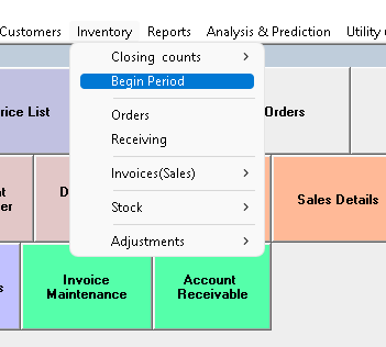 From the top home screen, go to: Inventory>Begin Period