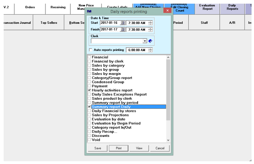 Select Reports to be automatically sent. If there’s no Daily Reports speed button, go to: Reports>Sales>Daily reports printing